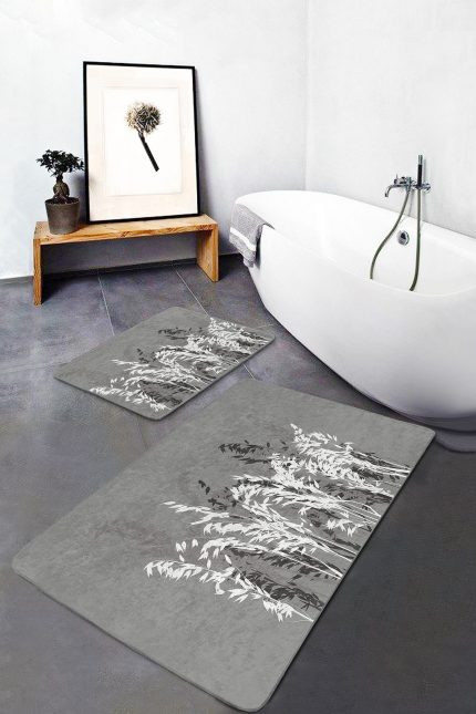 05 – Gray Ground Plant Design (Double Set) Non-Slip Base Bath Mat & Kitchen Mat Set