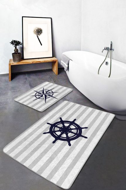 05 – Gray Striped Compass & Rudder Design (Double Set) Non-Slip Base Bath Mat & Kitchen Mat Set