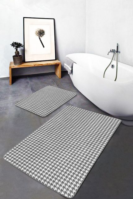 05 – Gray Crowbar Patterned Digital Printed (Double Set) Non-Slip Base Bath Mat & Kitchen Mat Set