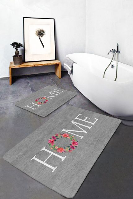 05 – Gray Floor Home Themed Digital Printed (Double Set) Non-Slip Base Bath Mat & Kitchen Mat Set