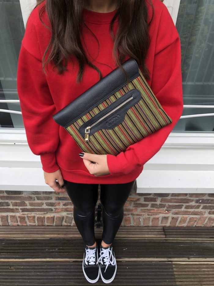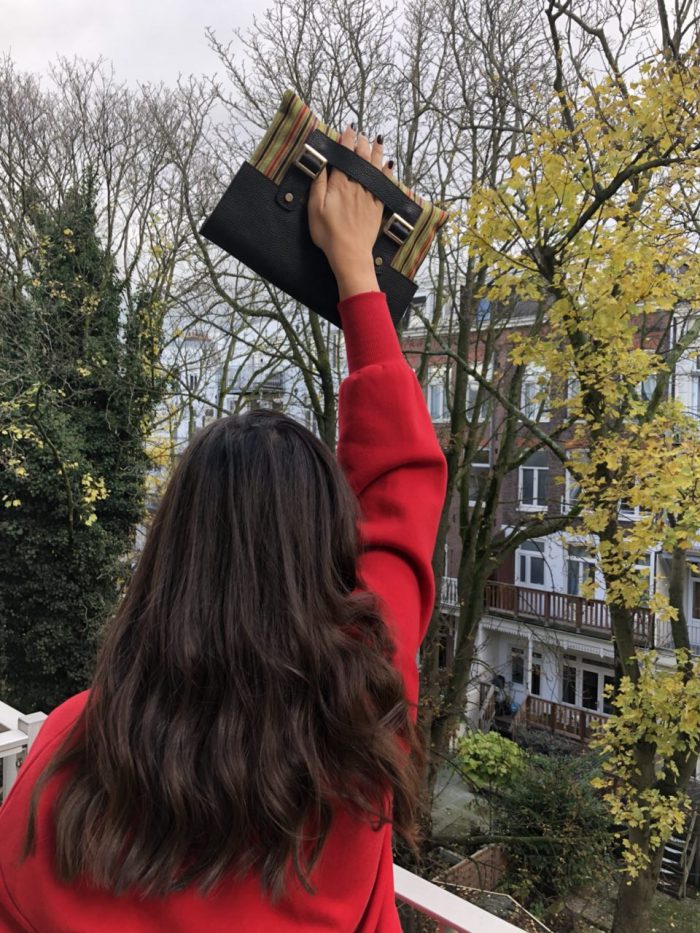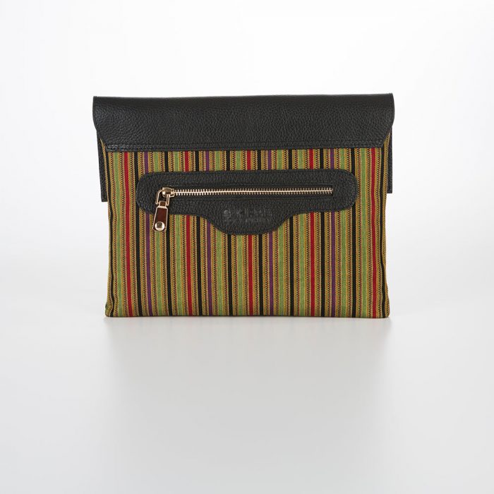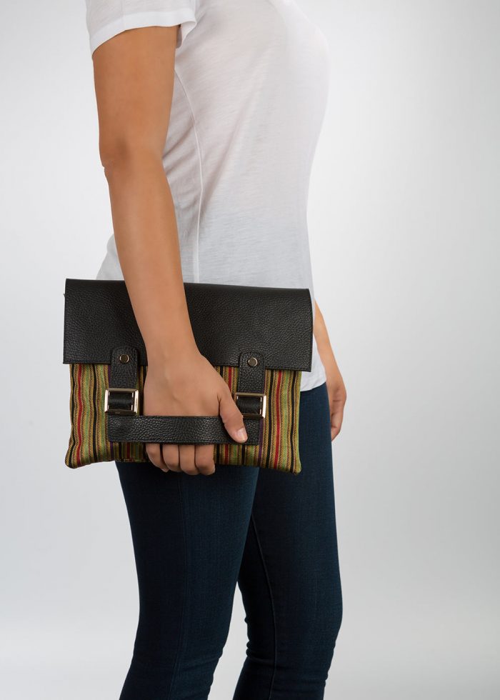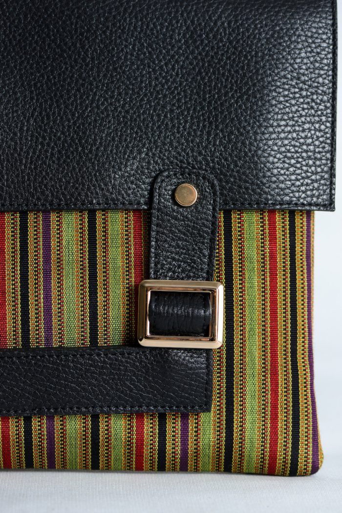 100% Black leather & Hand-woven silk and cotton Kutnu fabric