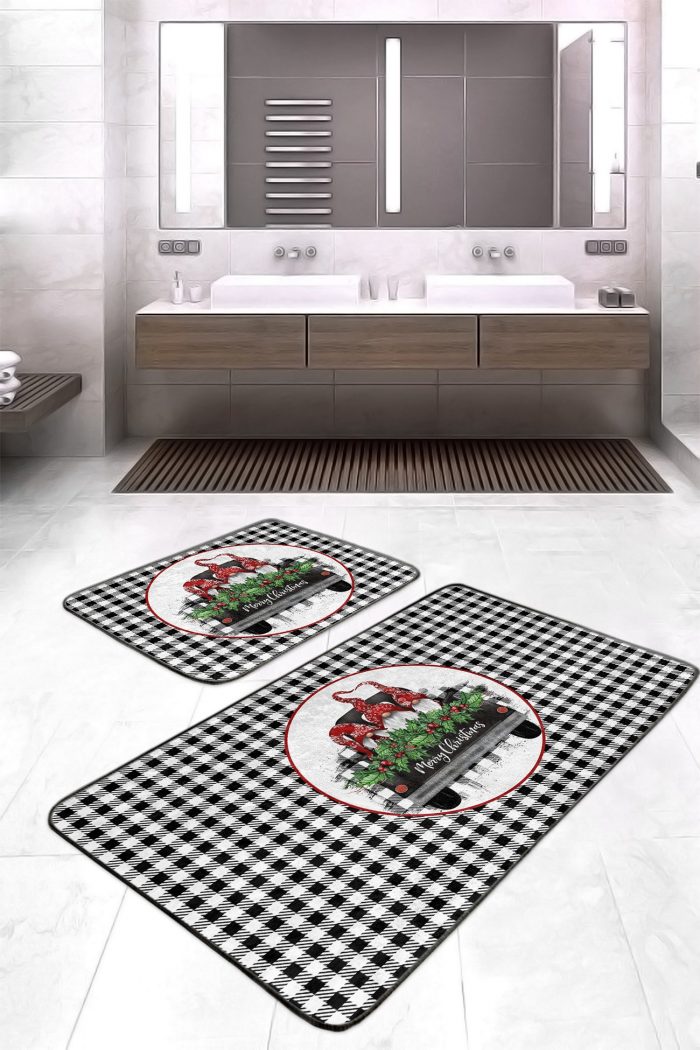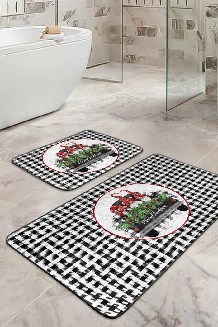 05 – Black and White Plaid Design (Double Set) Non-Slip Base Bath Mat & Kitchen Mat Set