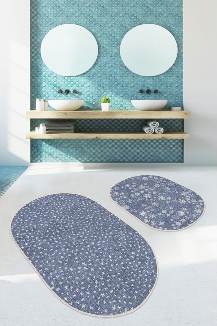 05 – Blue Code Pattern Digital Printed Oval (Double Set) Non-Slip Base Bath Mat & Kitchen Mat Set