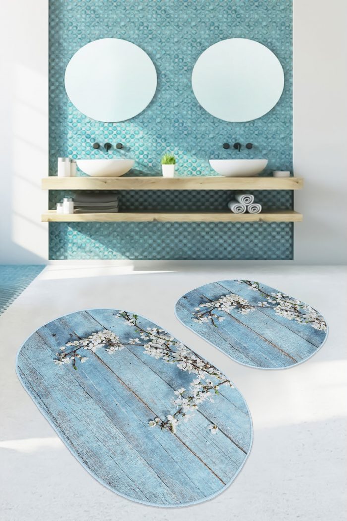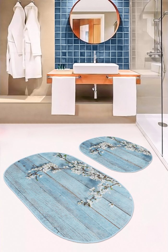 05 – Blue Wood Pattern Floral Design Oval (Double Set) Non-Slip Base Bath Mat & Kitchen Mat Set