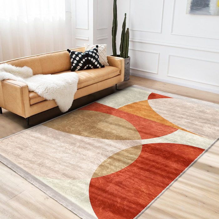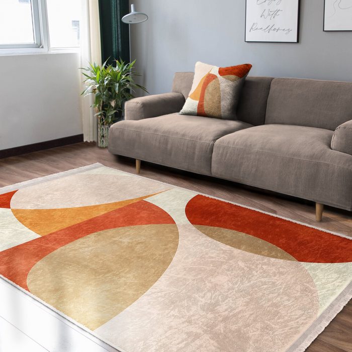 05 – Bohemian Modern Living Room & Living Room Bedroom Digital Printed Machine Washable Non-Slip Floor Fringed Rug with Abstract Pattern on Orange – Cream Floor