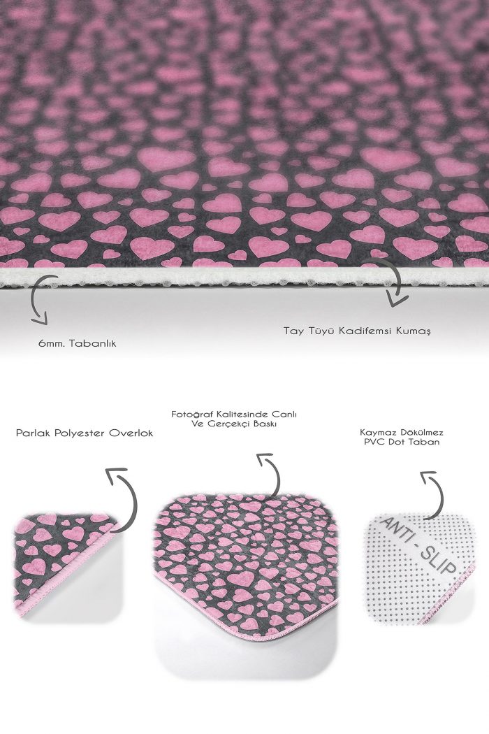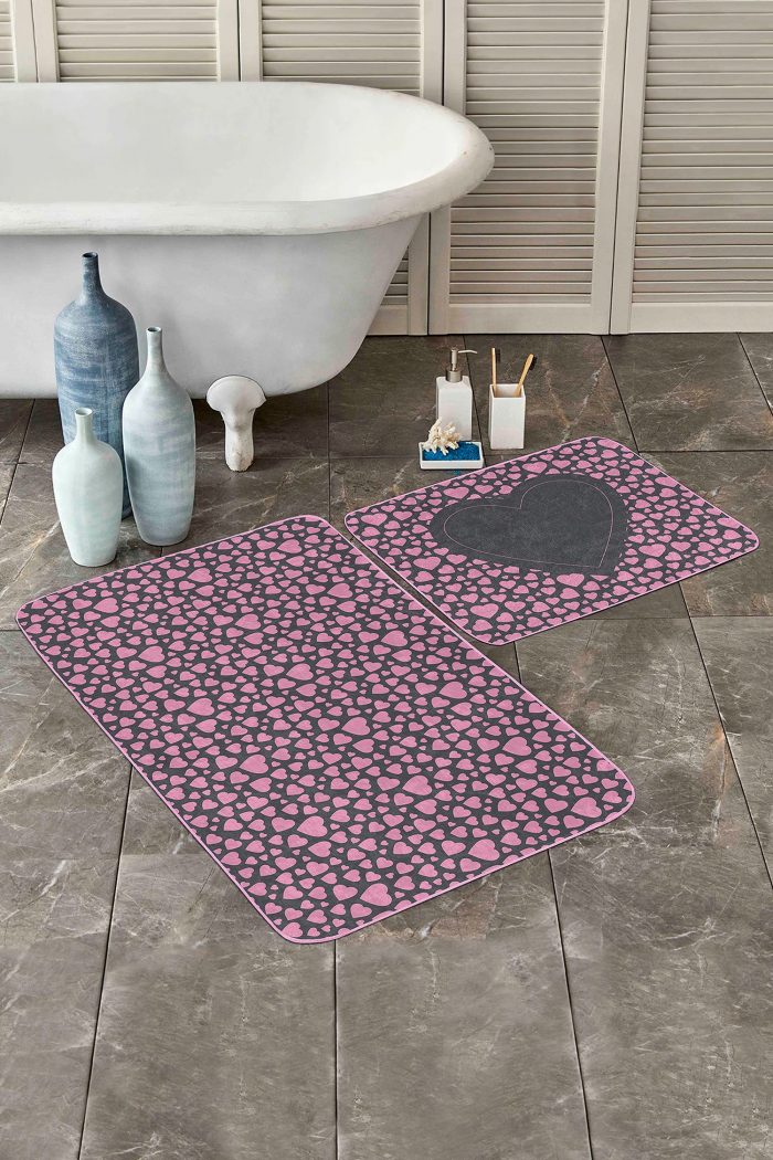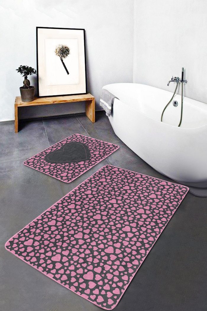 05 – Dark Smoke Floor Love Themed Heart Design (Double Set) Non-Slip Base Bath Mat & Kitchen Mat Set