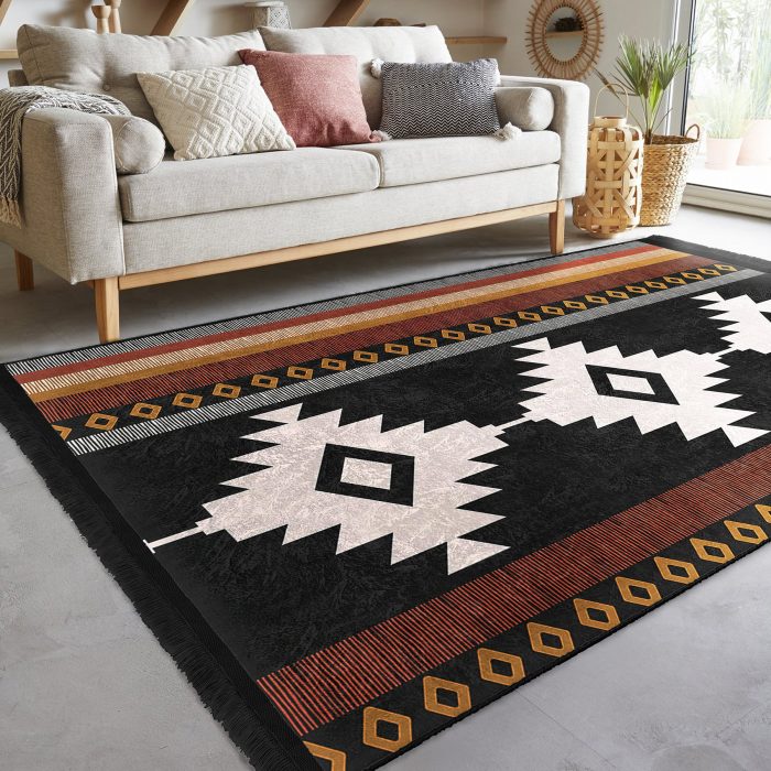 05 – Ethnic Motifs with Bohemian Patterns Brown Floor Geometric Living Room & Living Room Outdoor & Outdoor Digital Printed Machine Washable Non-Slip Floor Fringed Rug