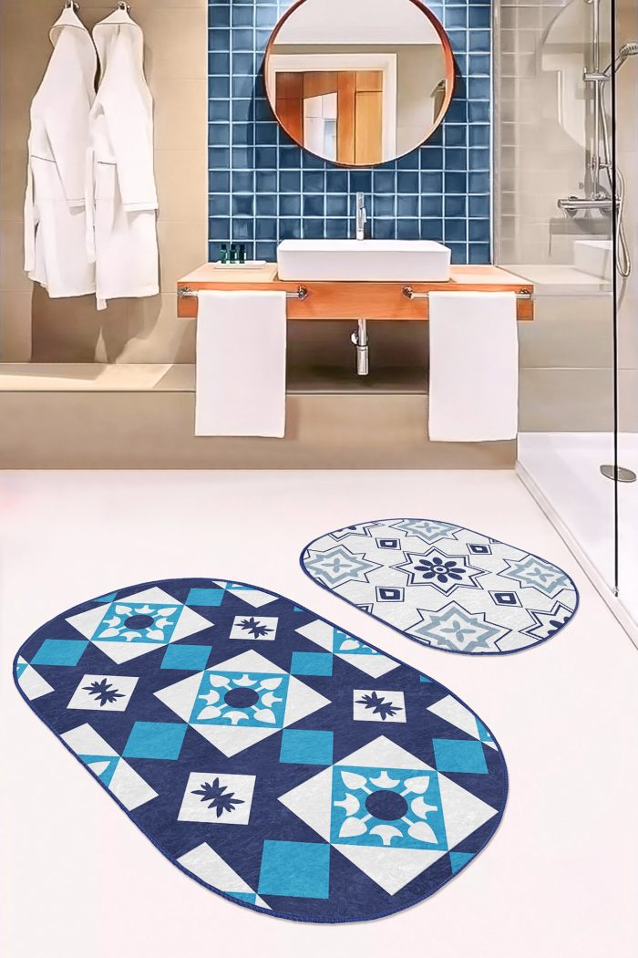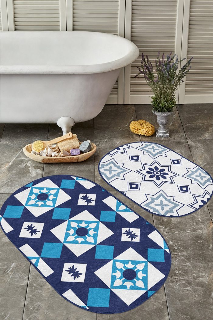 05 – Geometric Dark Blue Drawing Oval (Double Set) Non-Slip Base Bath Mat & Kitchen Mat Set