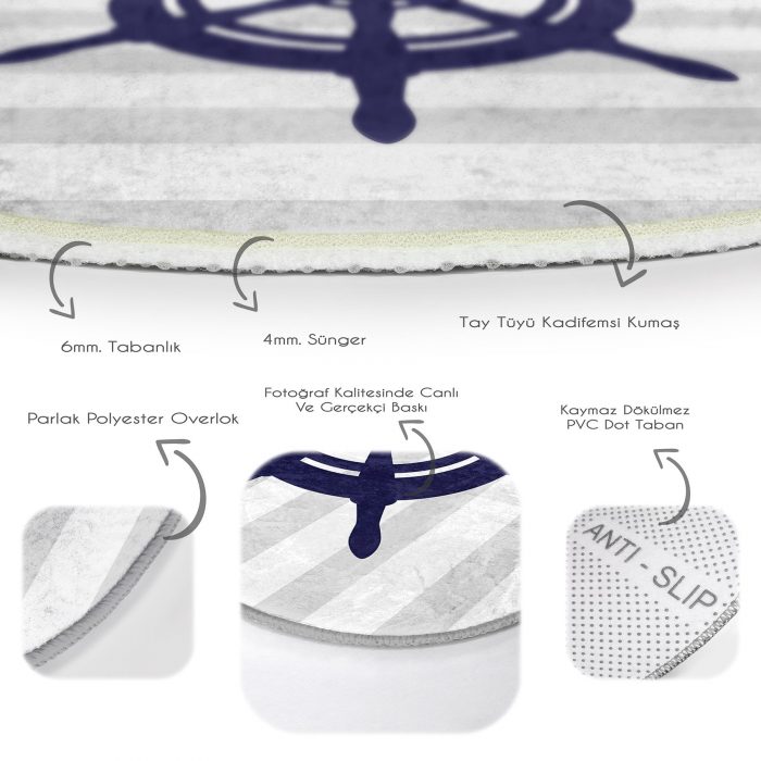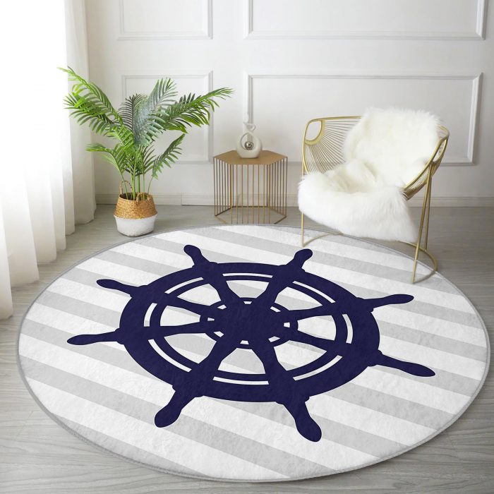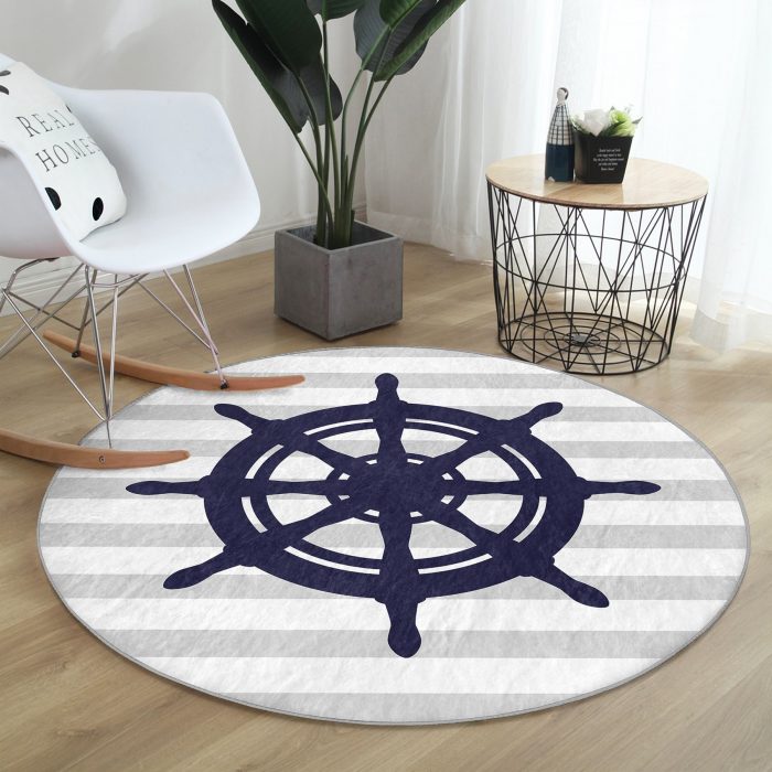 05 – Gray White Striped Anchor Pattern Digital Printed Modern Navy Blue Living Room and Living Room Round Rug With Washable Non-Slip Base