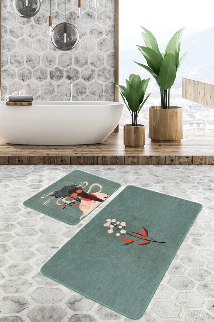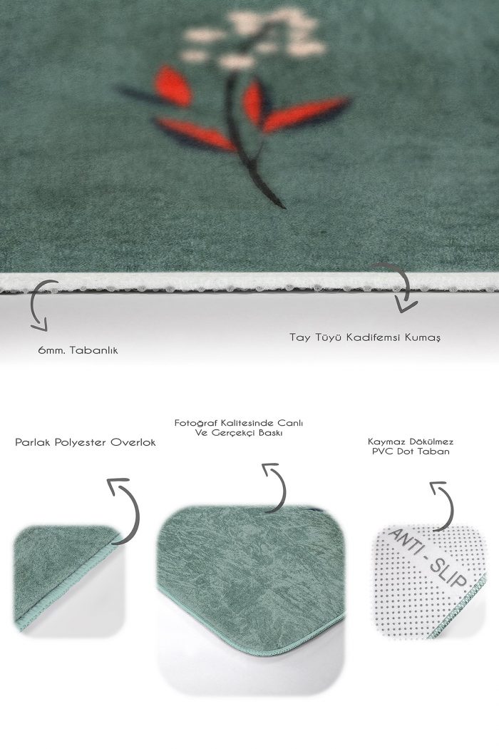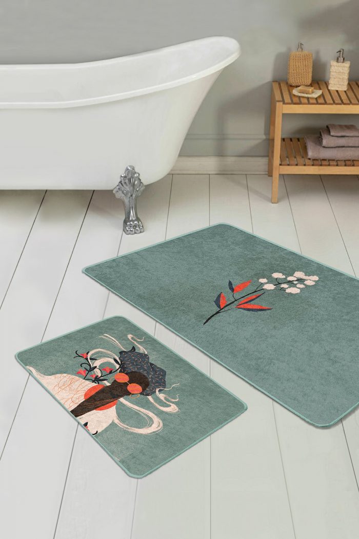 05 – Green Floor Floral Detail (Double Set) Non-Slip Base Bath Mat & Kitchen Mat Set