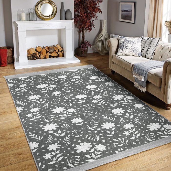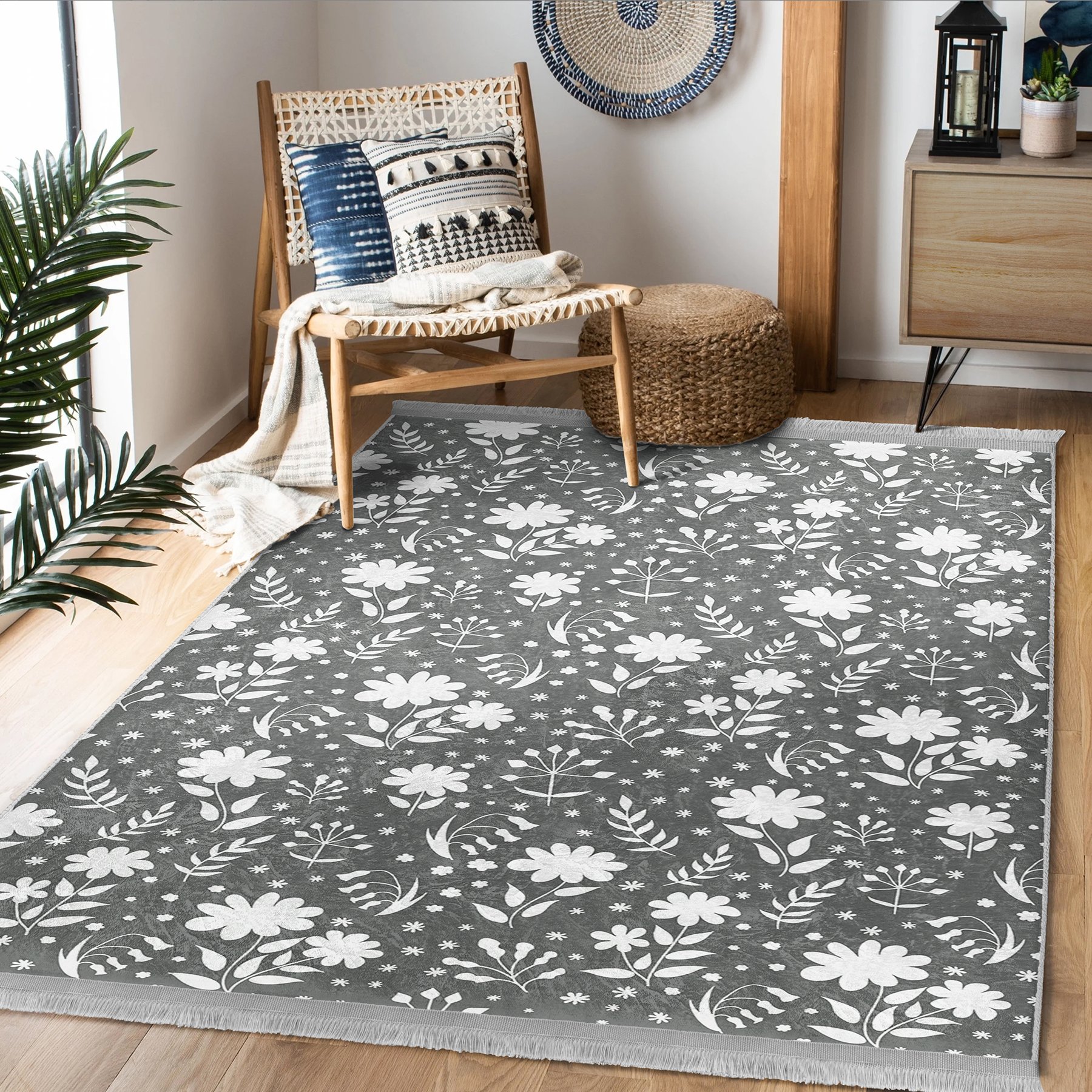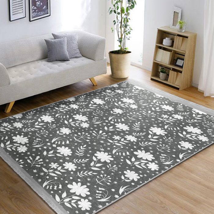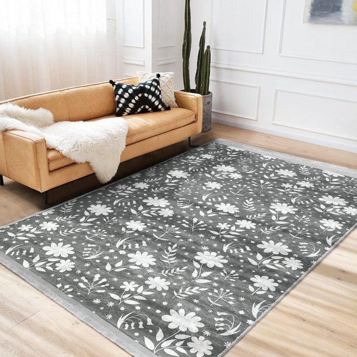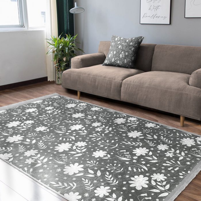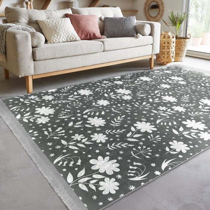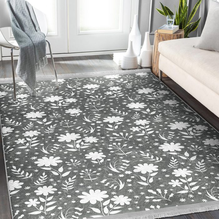 05 – Leaf Patterned Floral Patterned Floral Simple & Elegant Corridor & Entrance Kitchen Digital Printed Machine Washable Non-Slip Floor Fringed Rug on Gray – White Floor