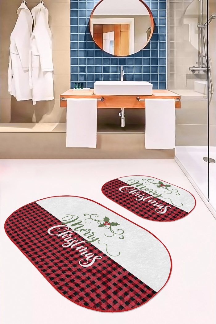 05 – Merry Christmas Pattern Oval (Double Set) Non-Slip Base Bath Mat & Kitchen Mat Set