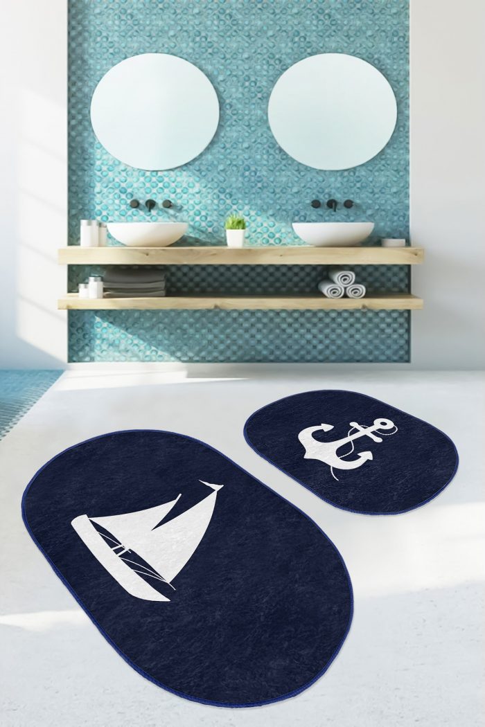 05 – Navy Blue Floor Anchor & Boat Patterned Oval (Double Set) Non-Slip Base Bath Mat & Kitchen Mat Set