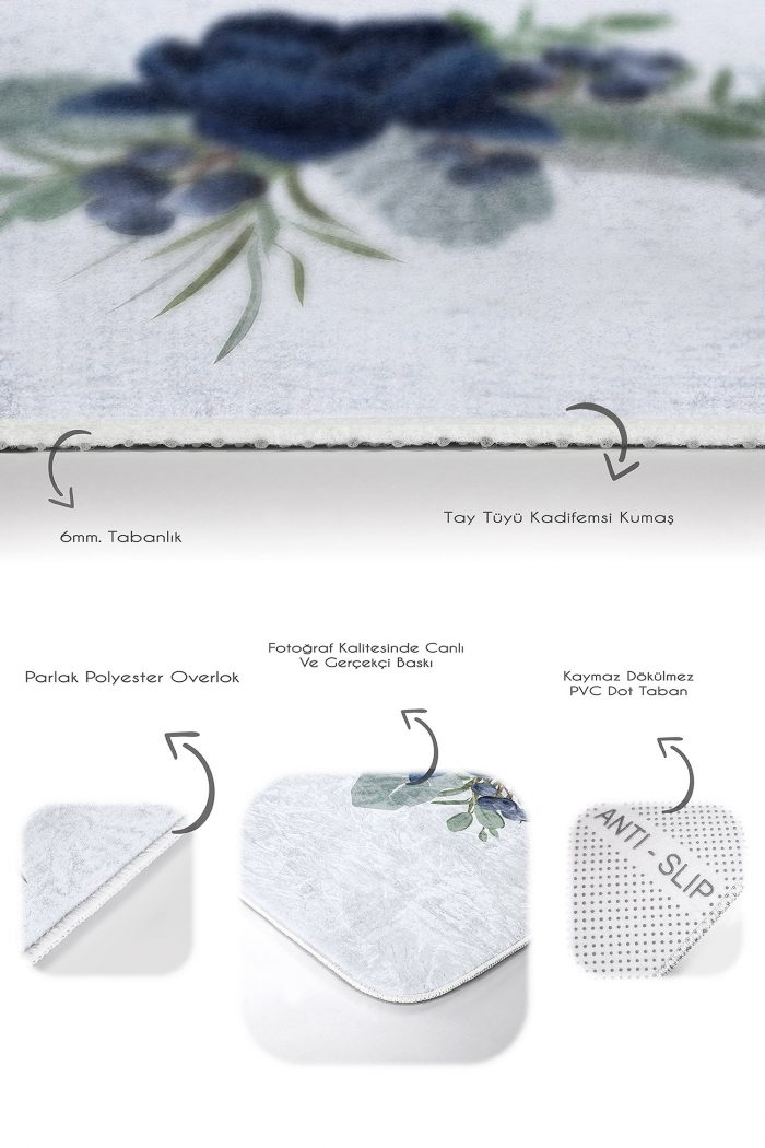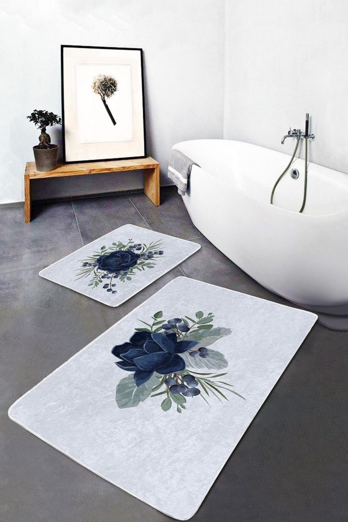 05 – Navy Blue Rose Design Digital Printed (Double Set) Non-Slip Base Bath Mat & Kitchen Mat Set