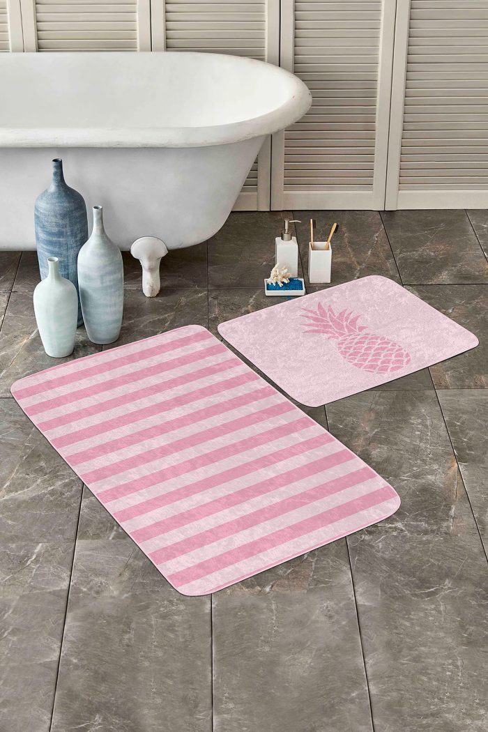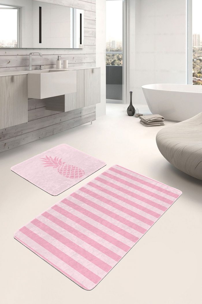 05 – Pink Striped Pineapple Pattern (Double Set) Non-Slip Base Bath Mat & Kitchen Mat Set