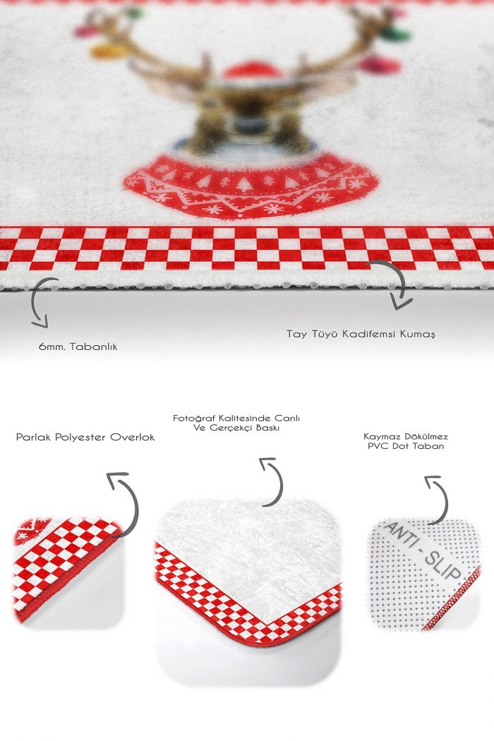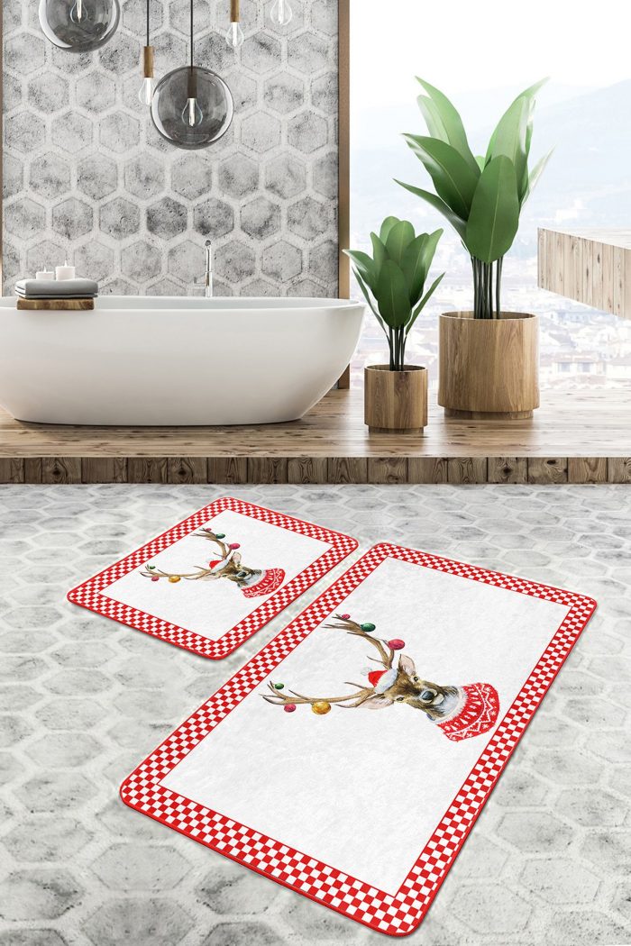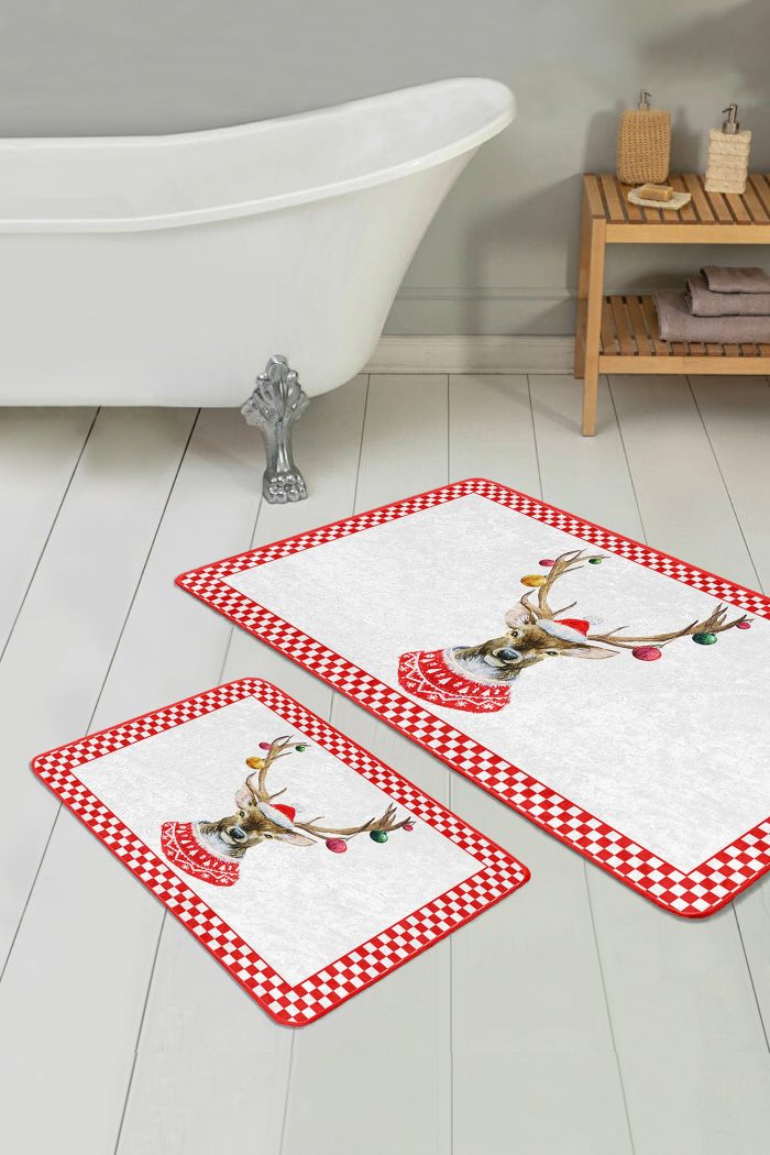 05 – Red Checker Framed Christmas Theme Deer (Double Set) Non-Slip Base Bath Mat & Kitchen Mat Set