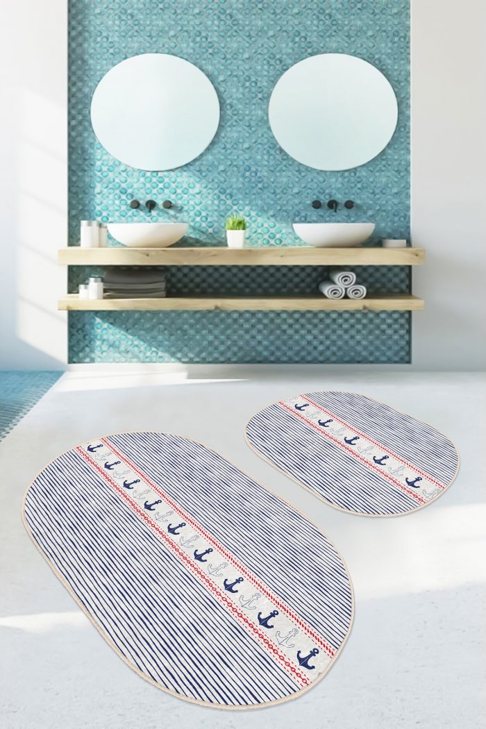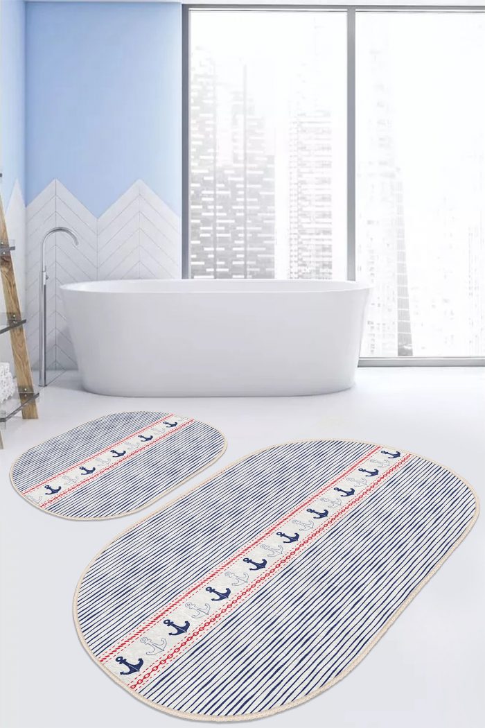 05 – Striped Floor Anchor Themed Digital Printed Oval (Double Set) Non-Slip Base Bath Mat & Kitchen Mat Set