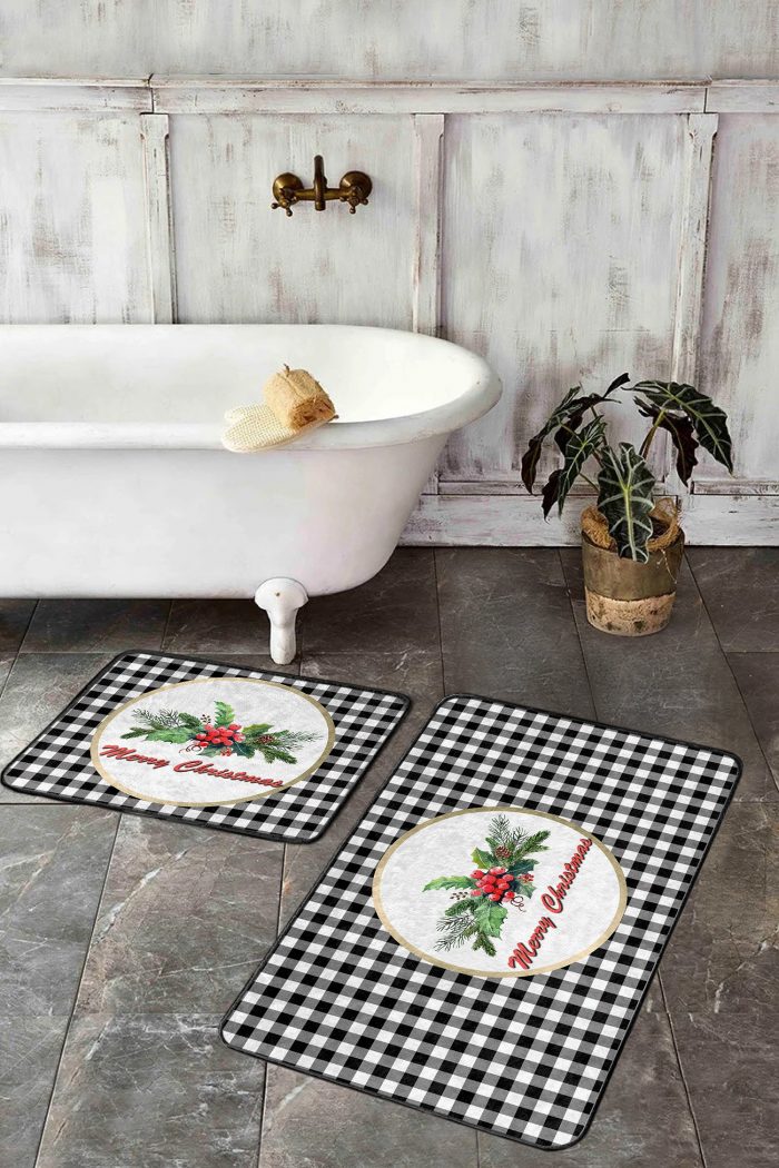 05 – Black Plaid Merry Christmas Pattern (Double Set) Non-Slip Base Bath Mat & Kitchen Mat Set