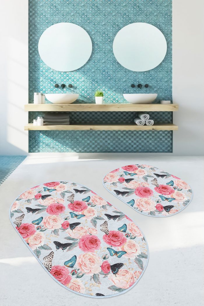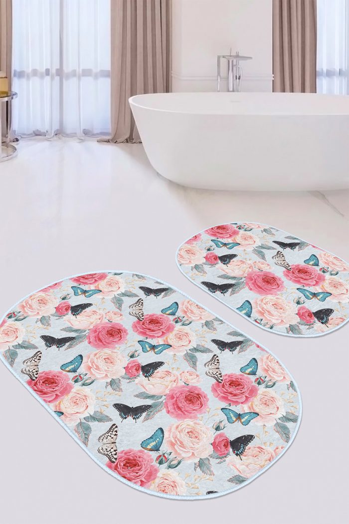 05 – Blue Floor Butterfly Rose Pattern Special Design Oval (Double Set) Non-Slip Base Bath Mat & Kitchen Mat Set
