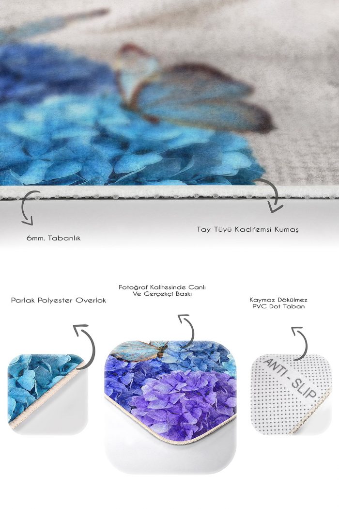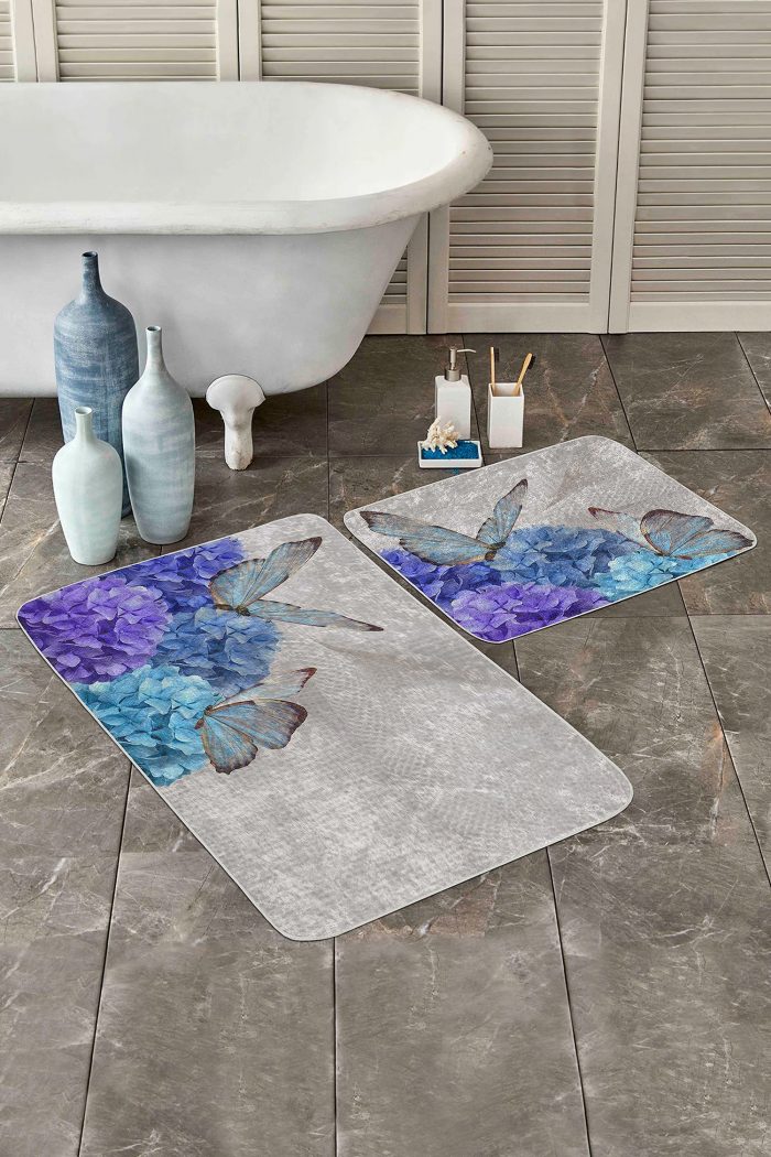 05 – Blue Hydrangea Flower Butterfly Pattern (Double Set) Non-Slip Base Bath Mat & Kitchen Mat Set