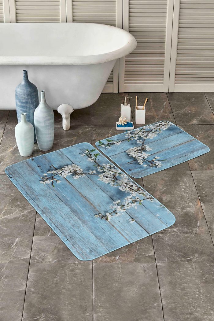 05 – Blue Wood Motif Floral Design (Double Set) Non-Slip Base Bath Mat & Kitchen Mat Set