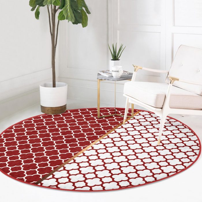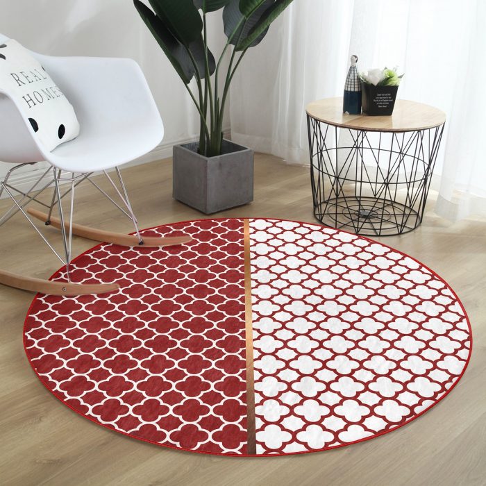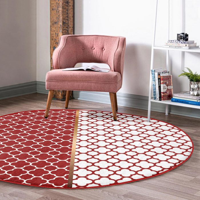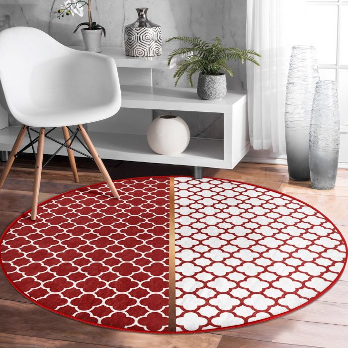 05 – Claret Red and White Ogea Patterned Digital Printed Modern Corridor Round Rugs With Washable Non-Slip Base