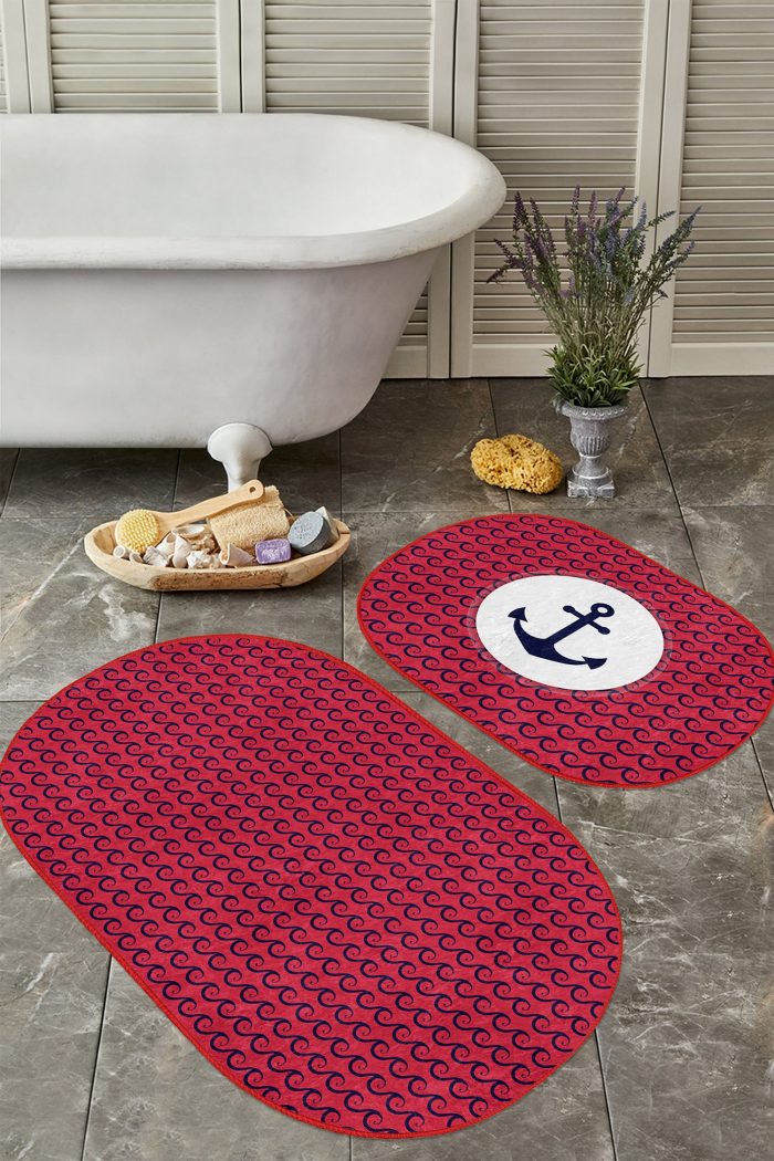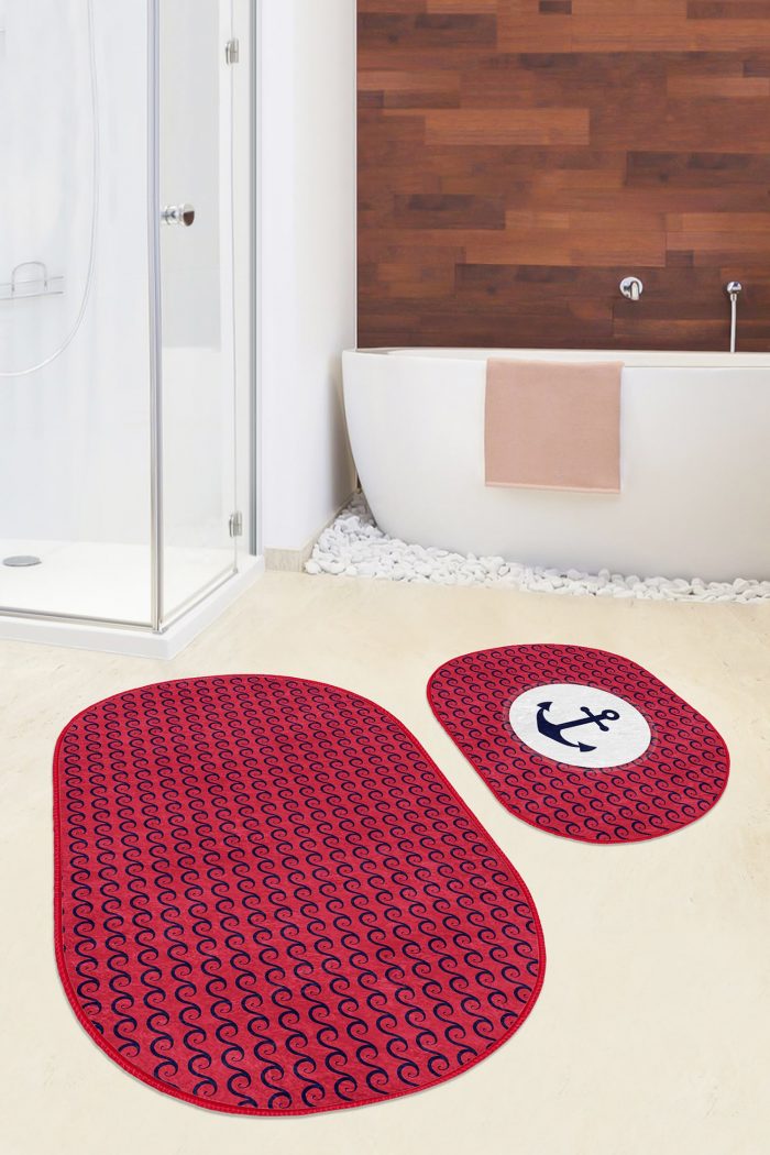 05 – Claret Red Floor Navy Blue Wave Detailed Special Design Oval (Double Set) Non-Slip Base Bath Mat & Kitchen Mat Set