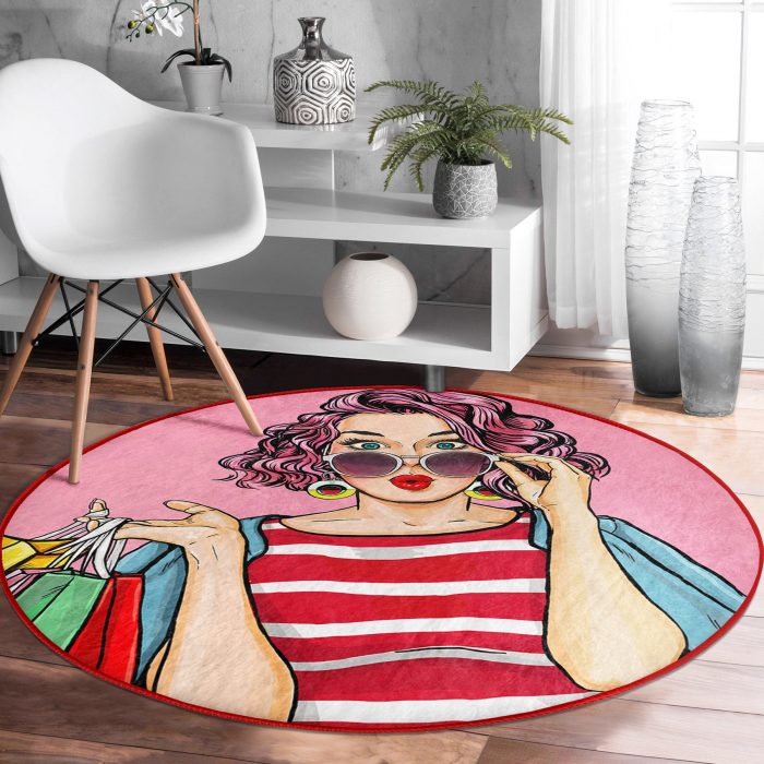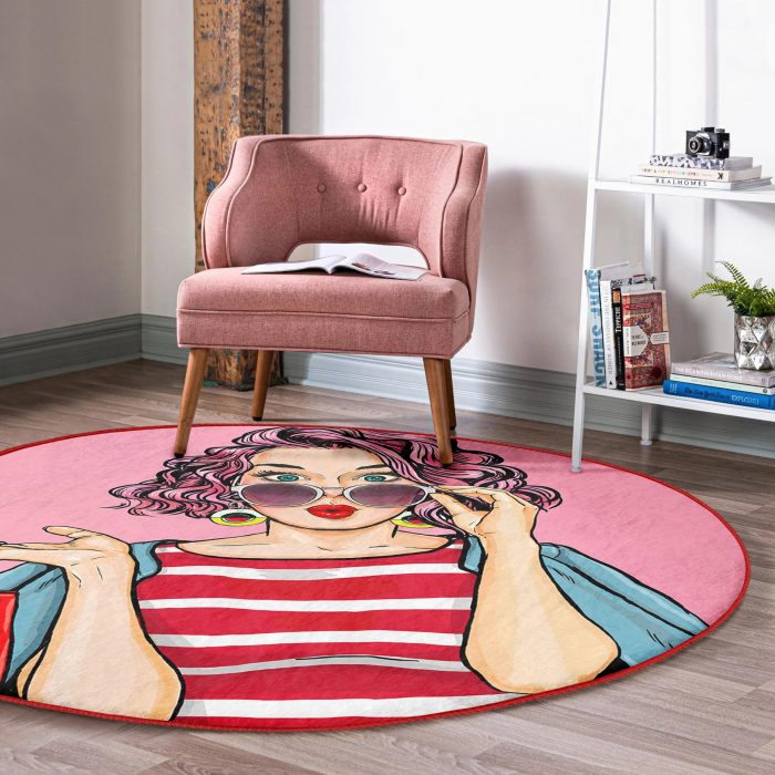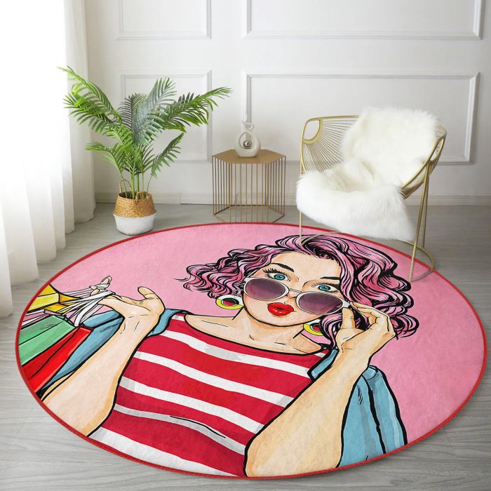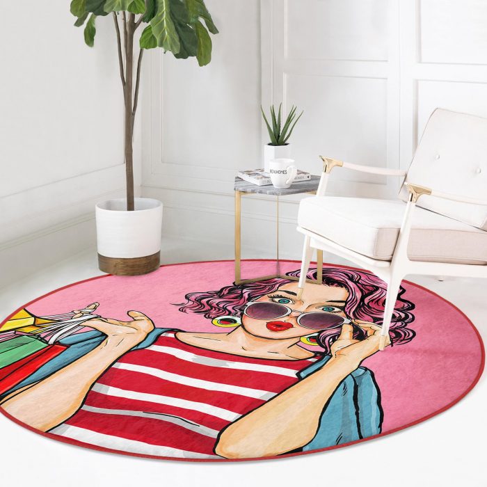 05 – Pink Floored Popart Pattern Children’s and Teenage Room Washable Non-Slip Base Round Rugs