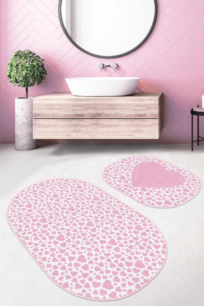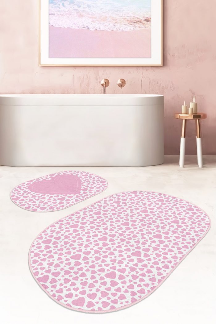 05 – White Background Love Themed Heart Pattern Oval (Double Set) Non-Slip Base Bath Mat & Kitchen Mat Set